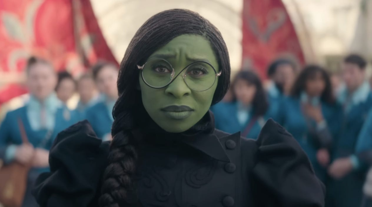 Likewise, there can be no doubt which version of the Oz story inspired Maguire to write his own. Above all, it’s a question of colour—that is, the colour of Elphaba, Maguire’s name for the future Wicked Witch, who wasn’t green till 1939, when Margaret Hamilton played her. This change too presumably originated as a bid to get the most from the medium, but Maguire and his successive adapters have interpreted it differently: Wicked is so directly a story about racial prejudice it hardly qualifies as a parable. The new movie sharpens the point through the casting of Erivo, who is Black, unlike Idina Menzel who originated the role on Broadway in 2003 (and is otherwise known as the voice of the extremely white Elsa in Frozen). While stage Elphabas have come from a range of backgrounds, the choice here is plainly not a “colour-blind” one—even if Erivo’s green make-up also evokes the tendency of modern fantasy and SF cinema to render the ethnicity of actors literally invisible.